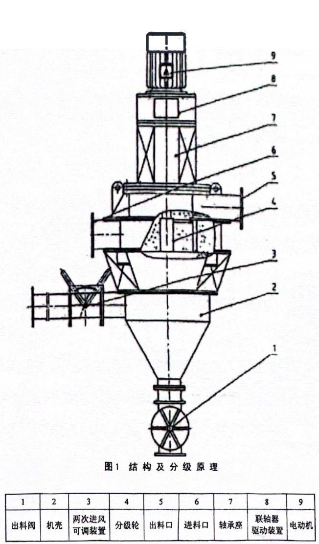 本機(jī)主要利用渦輪分級(jí)的分篩理論:旋轉(zhuǎn)渦輪產(chǎn)生的離心力與空氣所形成的向心力之間的平衡。其主要工作原理是:待分級(jí)的物料通過加料機(jī)被高壓負(fù)壓吸風(fēng)吸入分級(jí)室在這里首先被分散導(dǎo)向葉片分散,在渦殼與分級(jí)渦輪附近受強(qiáng)而有力的離心力場(chǎng)的作用,符合要求的微粉吸出分級(jí)葉輪后被收集裝置收集,粗料則落入下箱體,在這里由于受到二次進(jìn)風(fēng)的影響而被再次分散,夾雜在粗粉中的細(xì)粉再次隨氣流進(jìn)入分級(jí)區(qū),粗料則沿內(nèi)壁下落通過關(guān)風(fēng)機(jī)被收集。由于渦輪與上箱體采用特殊的密封機(jī)構(gòu),使得密封效果十分優(yōu)越,出料粒度更均勻。通過調(diào)節(jié)驅(qū)動(dòng)電機(jī)的轉(zhuǎn)速及二次進(jìn)風(fēng)量的大小,可得到最佳的分級(jí)效果。